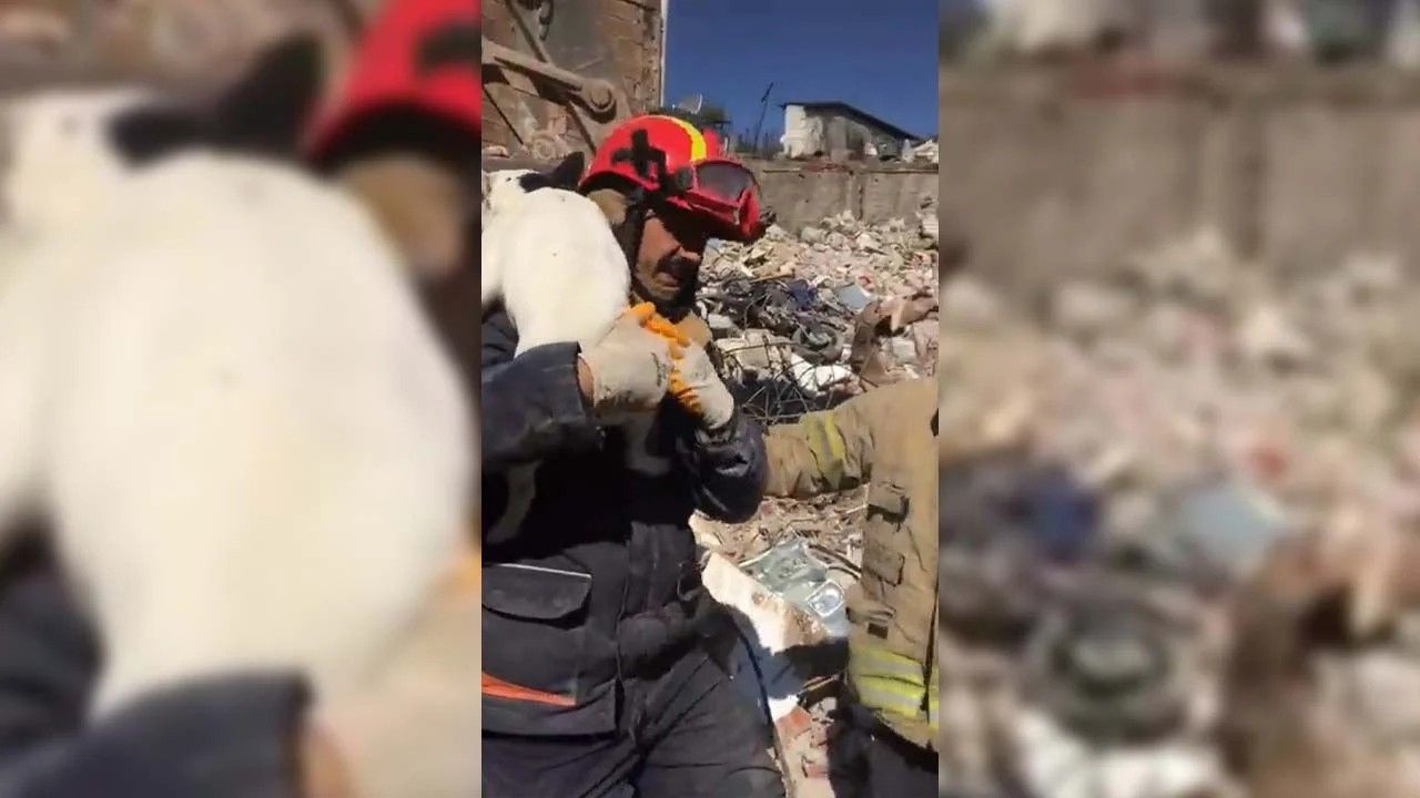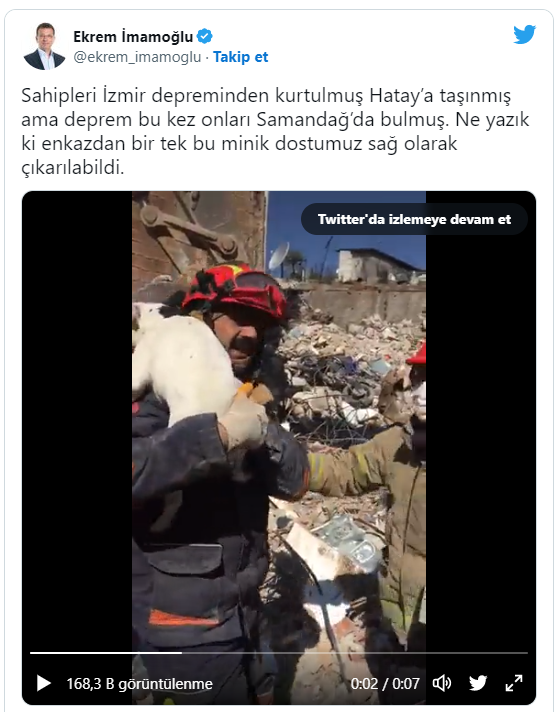 İstanbul Büyükşehir Belediye Başkanı Ekrem İmamoğlu, sosyal medya hesabından Maraş merkezli iki büyük depremin büyük hasar verdiği Hatay'ın Samandağı ilçesinden bir köpeğin enkazdan kurtarıldığı görüntüyü paylaştı.