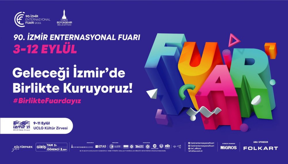 Türkiye Cumhuriyeti’nin ekonomik ve kültürel alandaki kalkınma hamlesinin öncü adımlarından İzmir Enternasyonal Fuarı, bir kez daha dünyayla buluşmaya hazırlanıyor. Fuar bu yıl 90’ıncı kez İzmir Büyükşehir Belediyesi ev sahipliğinde, İZFAŞ tarafından düzenlenecek. 3 – 12 Eylül tarihleri arasında açık kalacak fuarın ana sponsoru Folkart, etkinlik sponsoru ise Migros oldu. Pandemi nedeniyle sağlık önlemlerinin üst düzeyde olacağı İzmir Enternasyonal Fuarı’nda temalar “90 Yıldır Birlikte Kutluyoruz” ve “Geleceği İzmir'de Birlikte Kuruyoruz” olarak belirlendi. Uluslararası ticaretin en önemli buluşmalarından İzmir İş Günleri de bu yıl yedinci kez iş dünyasını online olarak buluşturacak. Fuar ile önemli bir buluşma da İzmir'de yapılacak. Birleşmiş Kentler ve Yerel Yönetimler Teşkilatı (UCLG) Kültür Zirvesi’nin dördüncüsü, fuar ile eş zamanlı olarak İzmir’de düzenlenecek. Dünyanın dört bir yanından kültür temsilcileri, zirve kapsamında 9 – 11 Eylül'de İzmir’de buluşarak kültür politikalarına ilişkin deneyimlerini paylaşacak.