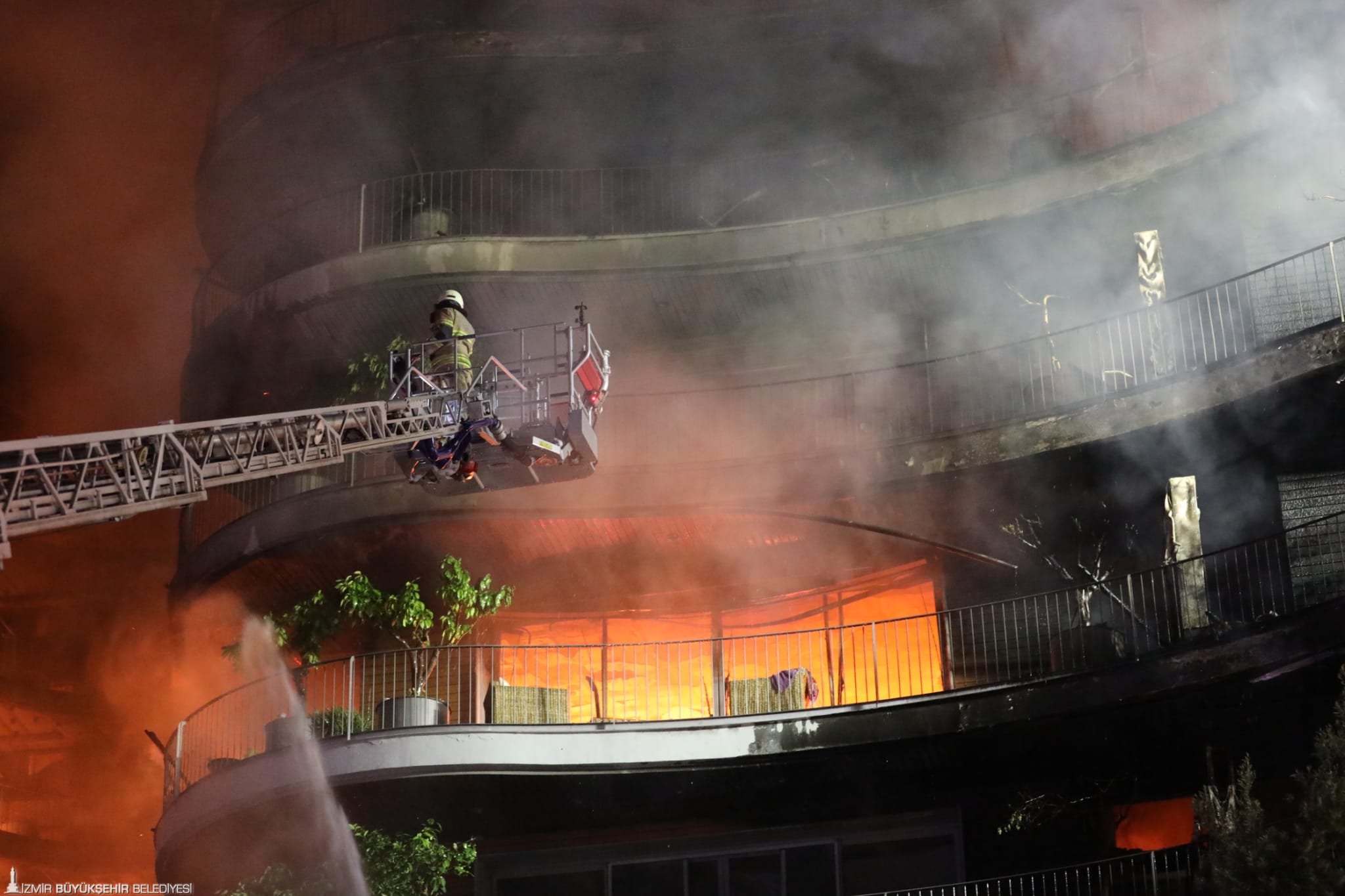 “Tahliye esnasında site içerisinde ikamet eden vatandaşlardan balkon kısımlarına çıkan biri çocuk 7 kişi merdivenli aracımız ile tahliye edilmiş, akabinde Mithatpaşa Caddesi kısmında mahsur kalan 3 kişinin ise binaya giren itfaiye söndürme ekibimiz tarafından tahliyesi sağlanmıştır. Tahliye ile eş zamanlı olarak yangına müdahale başlamış olup hem harici hem de dahili müdahale başlatılmıştır. Yangına müdahale esnasında su, köpük ve elimizde bulunan tüm teknik araç ile ekipman etkin şekilde kullanılmıştır. Yangına müdahale kısmında hem dahili hem de harici olarak en üst kattan zemine kadar söndürme çalışmaları cansiperane bir şekilde yürütülmüştür. Yangına Balçova grubu 22:01, Hatay grubu 22:03, Güzelbahçe grubu 22:09’da sevk edilmiştir.”