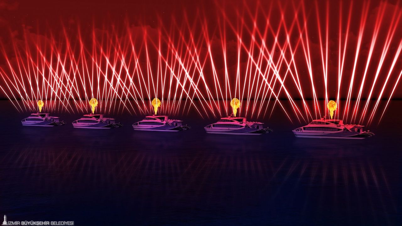 Kutlamalar kapsamında İZDENİZ’e bağlı 4 katamaran ve 1 araba vapurunda 1700 parça özel efektli pyro, 600 parça ışık kullanılacak. Gemiler, tüm izleyenlere müzik eşliğinde unutulmayacak bir görsel şölen sunacak. Sahil şeridindeki gösteri Cumhuriyet Meydanı’ndan başlayacak, Karşıyaka, Bostanlı ve Göztepe sahil rotasında izlenebilecek.