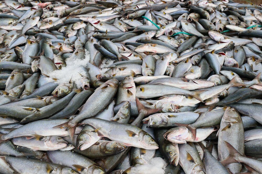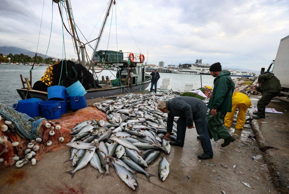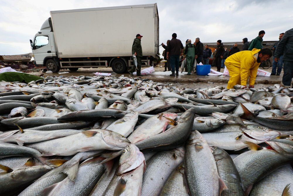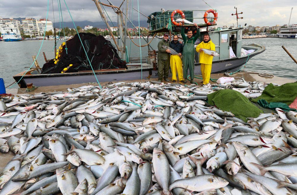 Diğer teknelerin yardımıyla kıyıya çekilen ağlardan çıkarılan 4 ila 10 kiloluk balıklar, yeteri kadar kasa olmadığı için barınağa döküldü. Buzlanarak kamyonetlere yüklenen balıklar İzmir Su Ürünleri Hali'ne götürüldü.