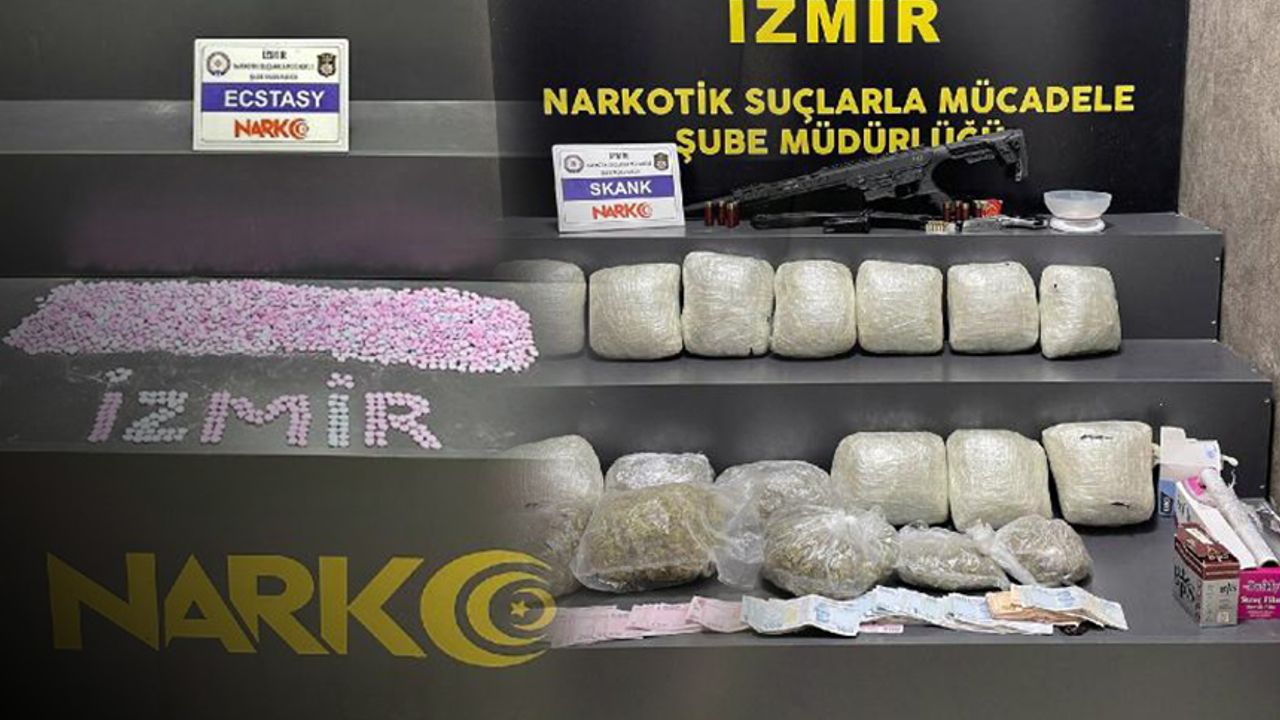 İzmir Emniyet Müdürlüğü Narkotik Suçlarla Mücadele Şube Müdürlüğü ekipleri, kente uyuşturucu ticareti yaptığı belirlenen şüphelilere yönelik iki ayrı operasyon düzenlendi. Karşıyaka ilçesindeki 2 ev ve 1 araç ile şehir dışından gelip İzmir'e giriş yaptıktan sonra Kemalpaşa ilçesinde durdurulan bir araca yapılan operasyonlarda 8 kilo 855 gram esrar, 2 bin 410 uyuşturucu hap, 1 tabanca ve 1 pompalı tüfek ile bunlara ait çok sayıda mermi ve fişek ele geçirildi. Uyuşturucu ticaretinden elde edildiği değerlendirilen 23 bin 855 TL nakit paraya da el kondu.