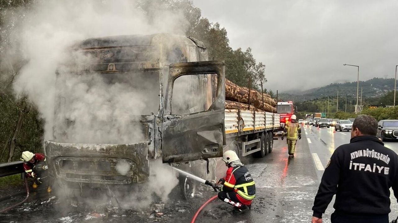 Alınan bilgiye göre, K.K. idaresindeki tomruk yüklü tır, Aydın-İzmir Otoyolu 75. Yıl Selatin Tüneli yakınlarında seyir halindeyken henüz belirlenemeyen nedenle alev aldı.