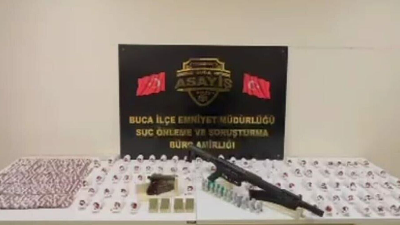 Buca İlçe Emniyet Müdürlüğü ekipleri ekiplerinin uyuşturucu madde ticareti ve ruhsatsız silah bulundurma, taşıma veya satın alma suçlarına yönelik yaptığı çalışmada yakalanan V.B.'nin İnönü Mahallesi'ndeki evinde arama yapıldı. Şüphelinin adresinde yapılan aramada 7 bin sentetik ecza, ruhsatsız tabanca tüfek, ruhsatsız tabanca ve ruhsatsız tüfek ele geçirildi. Gözaltına alına V.B hakkında adli işlem başlatıldı. (DHA)
