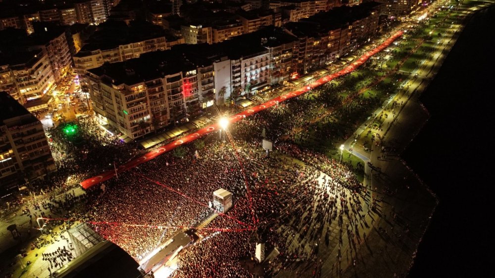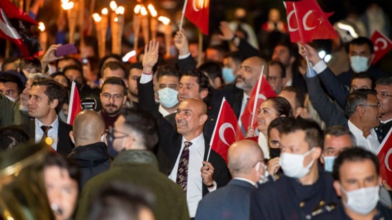 Binlerce İzmirli, 350 metrelik Türk bayrağı ile Gündoğdu Meydanı'na yürüdü. Renkli karelere sahne olan korteje, İzmir Büyükşehir Belediye Başkanı Tunç Soyer, CHP İzmir Milletvekili Özcan Purçu, Menderes Belediye Başkanı Mustafa Kayalar ile eşi Aslı Kayalar, CHP İzmir İl Başkanı Deniz Yücel, İzmir Büyükşehir Belediyesi Meclis Üyesi Nilay Kökkılınç, İzmir Büyükşehir Belediye Başkan Vekili Mustafa Özuslu, İzmir Büyükşehir Belediyesi Genel Sekreteri Dr. Buğra Gökçe, İzmir Büyükşehir Belediyesi Genel Sekreter Yardımcısı Ertuğrul Tugay, CHP İzmir Gençlik Kolları Başkanı Burak Kotan, bürokratlar, meclis üyeleri, sivil toplum kuruluşları, odalar ve derneklerin başkanları ile temsilcileri ve vatandaşlar katıldı. Gündoğdu Meydanı'nda sona eren kortejin ardından İzmir Büyükşehir Belediye Başkanı Tunç Soyer, Gündoğdu Meydanı’nı dolduran İzmirlilere "Kurtuluşun ve kuruluşun şehri İzmir, Cumhuriyet'in ikinci yüzyılında da bütün Türkiye’ye ışık tutacak. Türkiye’nin her yerinde çiçekler açacak. Hepinizi çok seviyorum, bayramımız kutlu olsun. Cumhuriyet'in yıkılmaz kalesi İzmir. Güzel İzmir'in güzel insanları. Şahane bir akşam, en büyük bayramımız kutlu olsun. Cumhuriyet'in ikinci yüzyılına adım adım yaklaşırken Cumhuriyet'i korumayı, değerlerine sahip çıkmayı sonuna kadar sürdüreceğiz. Umudumuz büyük, biliyoruz ki kurtuluşun ve kuruluşun şehri İzmir, Cumhuriyet'in ikinci yüzyılında da bütün Türkiye'ye ışık tutacak. Türkiye'nin her yerinde çiçekler açacak. Hepinizi çok seviyorum, bayramımız kutlu olsun" diye konuştu.