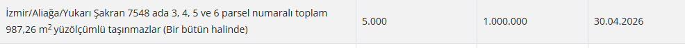 İzmir’in Aliağa ilçesi Yukarı Şakran Mahallesi’nde bulunan, toplam 987,26 metrekare yüzölçümüne sahip 7548 ada üzerindeki 3, 4, 5 ve 6 parseller bir bütün halinde satışa çıkarıldı.