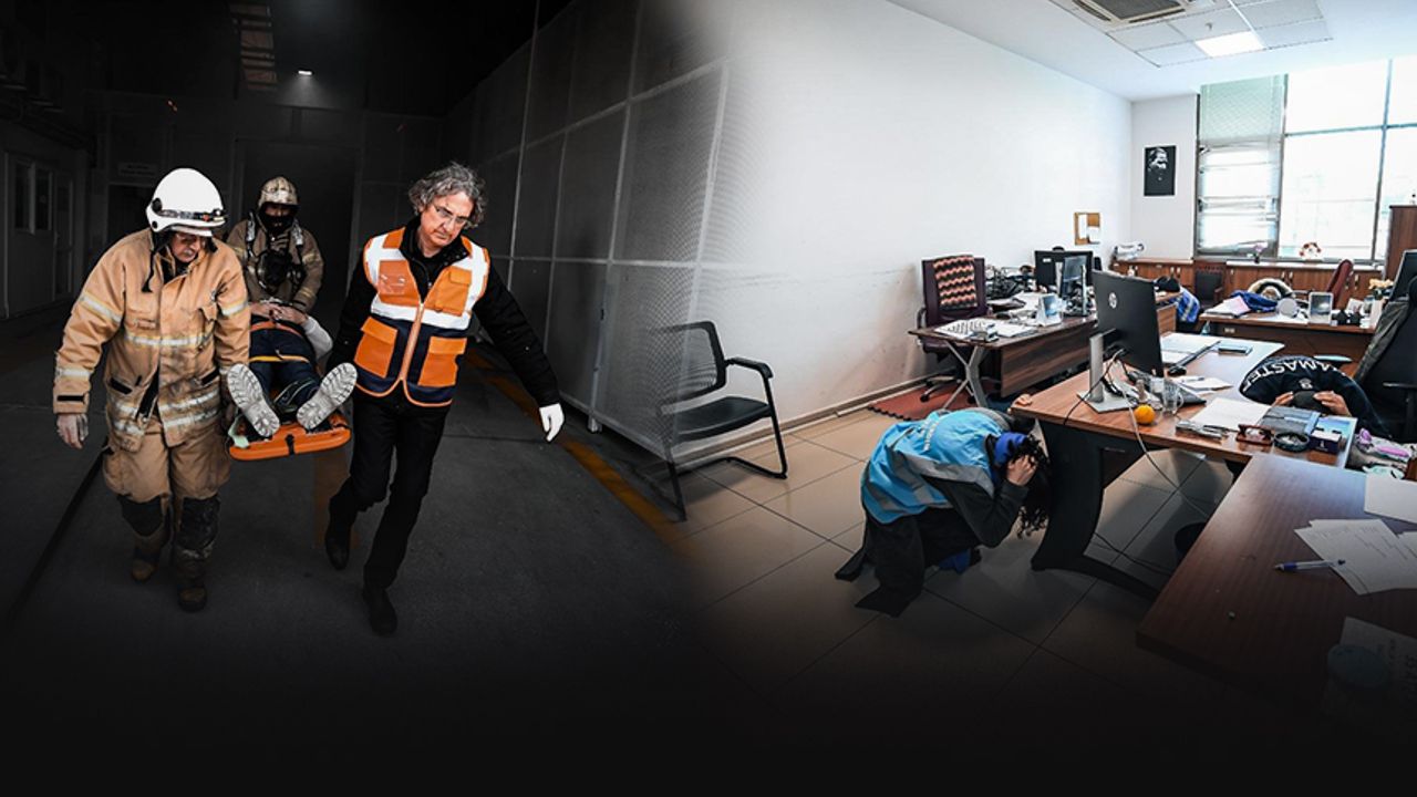 İzmir Büyükşehir Belediyesi Afet İşleri Dairesi Başkanlığı ve İtfaiye Dairesi Başkanlığı olası afetlere karşı hazırlıklı olmak amacıyla Bornova Aşık Veysel Rekreasyon Alanı’ndaki Buz Sporları Salonu ile ESHOT Genel Müdürlüğü’nün Gediz Ağır Bakım Tesisleri’nde deprem ve yangın tatbikatı yaptı. Senaryoya göre İzmir’de 6.1 büyüklüğünde deprem meydana geldi. Buz Sporları Salonu’nda bulunan personel “çök-kapan-tutun” yöntemiyle kendilerini koruyarak raflardan düşen malzemelere karşı önlem aldı. Sarsıntının sona ermesinin ardından, acil durum ekiplerinin yönlendirmesiyle yurttaşlar bina dışına çıkarıldı. Tahliye sırasında binada bulunan çay ocağının elektrik aksamından yangın çıktığı belirlendi. Yangın alarmı çalıştırılarak, 112 Acil Çağrı Merkezi’ne ihbarda bulunuldu. Acil durum ekipleri yangına ilk müdahaleyi yaptı. Toplanma alanında yapılan sayımda iki personelin eksik olduğu belirlendi. Eksik personelden biri, acil durum ekipleri tarafından yaralı şekilde çay ocağından kurtarılarak ilk yardım ekibine teslim edildi. Ancak diğer personel binanın ikinci katında mahsur kaldı. Olay yerine kısa sürede ulaşan itfaiye ekipleri, alevlerin hızla yükseldiği çay ocağındaki yangını kısa sürede kontrol altına aldı ve mahsur kalan personeli merdivenli araç ile güvenli bir şekilde kurtararak sağlık ekiplerine teslim etti.