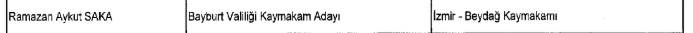 Karara göre Bergama Kaymakamı Avni Oral, Ankara’nın Çankaya ilçesine kaymakam olarak atandı. Beydağ Kaymakamlığı görevine ise Bayburt Valiliği Kaymakam Adayı Ramazan Aykut Saka getirildi.