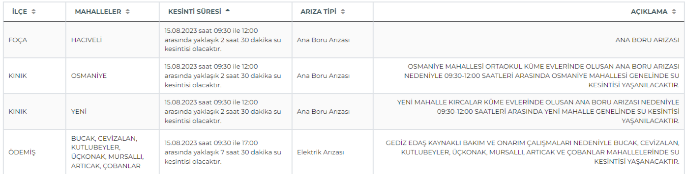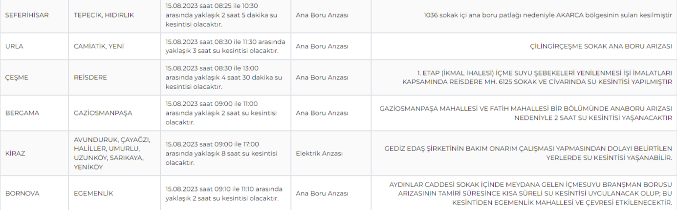İzmir'de bugün su kesintisi olacak mı? İzmir'de sular ne zaman gelecek? Soruları yoğun olarak araştırılıyor. İZSU bugüne ait planlı kesinti haritasını duyurdu. İşte 15 Ağustos 2023 Salı, İzmir su kesintisi detayları...