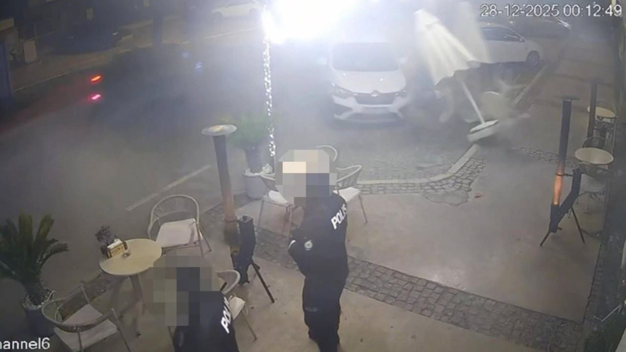 Bu arada kaza, çevredeki bir iş yerinin güvenlik kamerasına yansıdı. Görüntülerde, 2 polis memurunun iş yeri önünde beklediği sırada otomobilin polis aracına çarptığı, çarpmanın etkisiyle masa, sandalye ve şemsiyelerin devrildiği görüldü. (DHA)