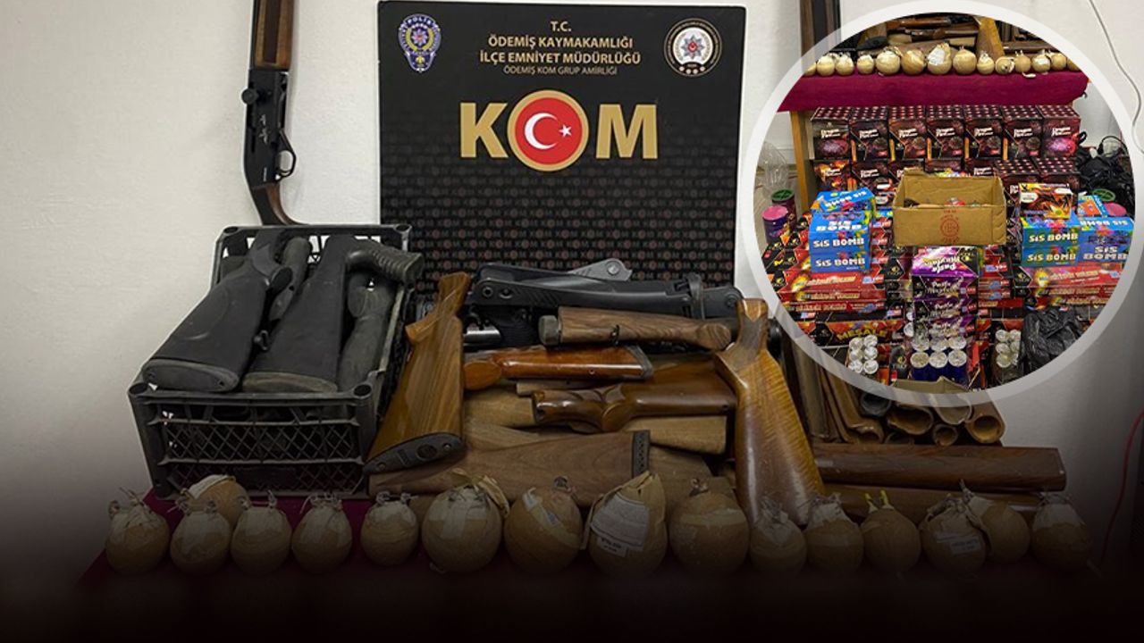 Adreste yapılan aramada, 743 çeşitli tabanca parçası, 32 patlayıcı özelliğe sahip piroteknik madde, 60 tabanca fişeği, 2 ruhsatsız tüfek, 3 bin 607 havai fişek, çok sayıda namlu ucu açmaya yarayan teknik malzeme ele geçirildi.