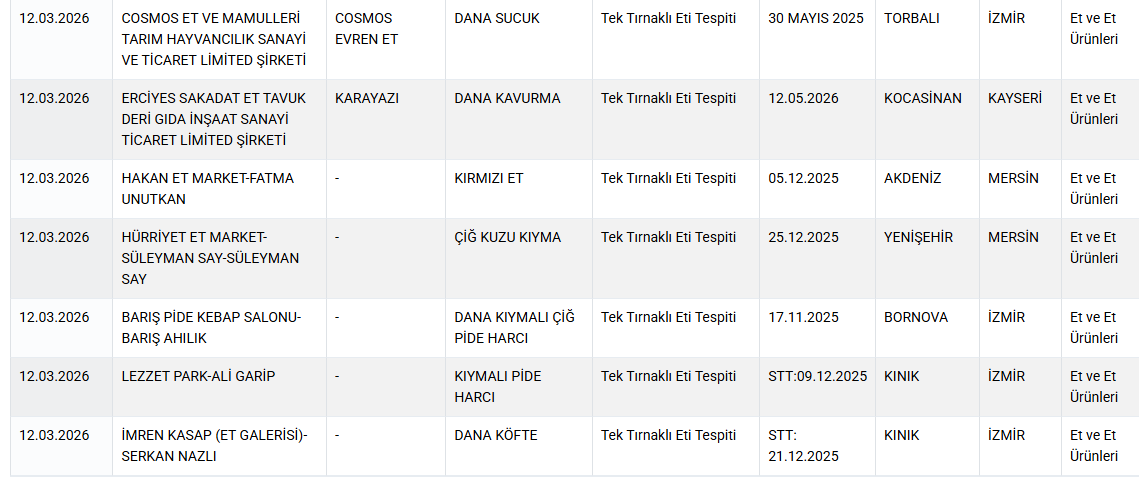 İzmir’de yapılan denetimlerde; Kınık ilçesinde faaliyet gösteren İmren Kasap (Et Galerisi) tarafından satışa sunulan dana köfte, Bornova’daki Barış Pide Kebap Salonu tarafından hazırlanan dana kıymalı çiğ pide harcı ve Torbalı’da üretim yapan Cosmos Et ve Mamulleri tarafından üretilen Cosmos Evren Et markalı dana sucukta tek tırnaklı hayvan eti bulunduğu belirlendi.