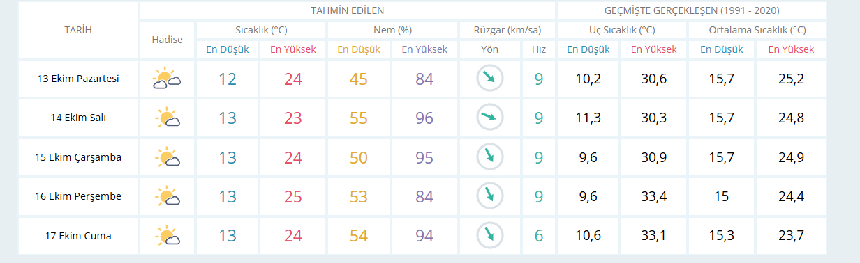 Hafta boyunca hava sıcaklıkları gündüz 23-25°C, gece ise 12-13°C civarında seyredecek. Geçmiş yılların ortalamasıyla karşılaştırıldığında, sıcaklıkların mevsim normallerine oldukça yakın olacağı tahmin ediliyor.