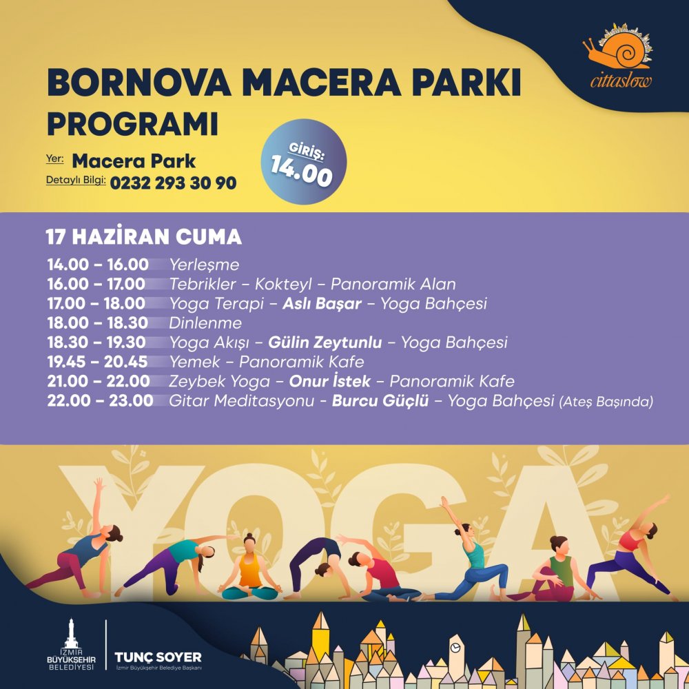 Macera Parkı’nda “Matını ve çadırı al gel” sloganıyla düzenlenecek yoga kampı kapsamında 17 Haziran Cuma günü Aslı Başar ile yoga terapi, Gülin Zeytinlu ile yoga akışı, Onur İstek ile zeybek yoğa, Burcu Güçlü ile gitar meditasyonu, 18 Haziran Cumartesi günü Begüm Berberoğlu ile sunrise yoga, Saadet Çıngır ile Sivanando yoga, Yelda Çetiner ile holistik nefes ve mindfulness, Uzm. Psk. Selver Tunca Tutan Koç ile yaşam ağacım, Yeşim Atik ile Yin Yoga, Gülen Şerbetman ile gong eşliğinde sound heading, Begün Berberoğlu ile masal terapisi yapılacak.