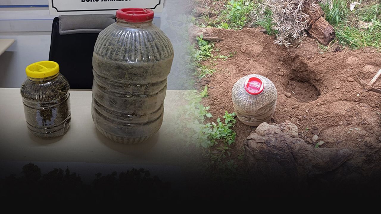 Ev ve bahçede yapılan aramada, toprağa gömülmüş plastik bidonlarda 2 kilo 750 gram esrar ele geçirildi.