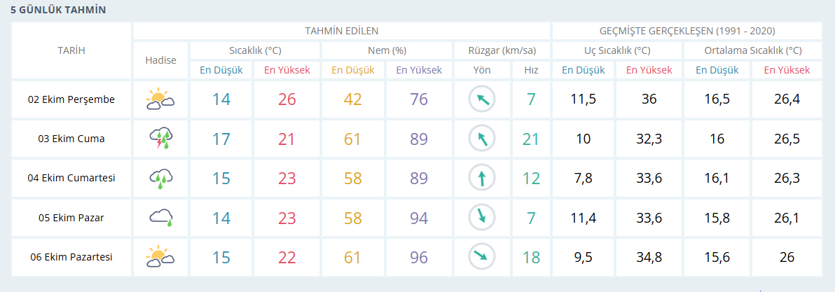 Tahminlere göre sıcaklıklarda önemli bir değişiklik olmayacak. İzmir’de hava 2 Ekim Perşembe günü 14-26 derece aralığında seyrederken, 3 Ekim Cuma günü 17-21 dereceye düşecek. Hafta sonu ise en düşük 14, en yüksek 23 derece civarında olacak.