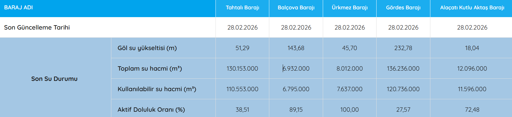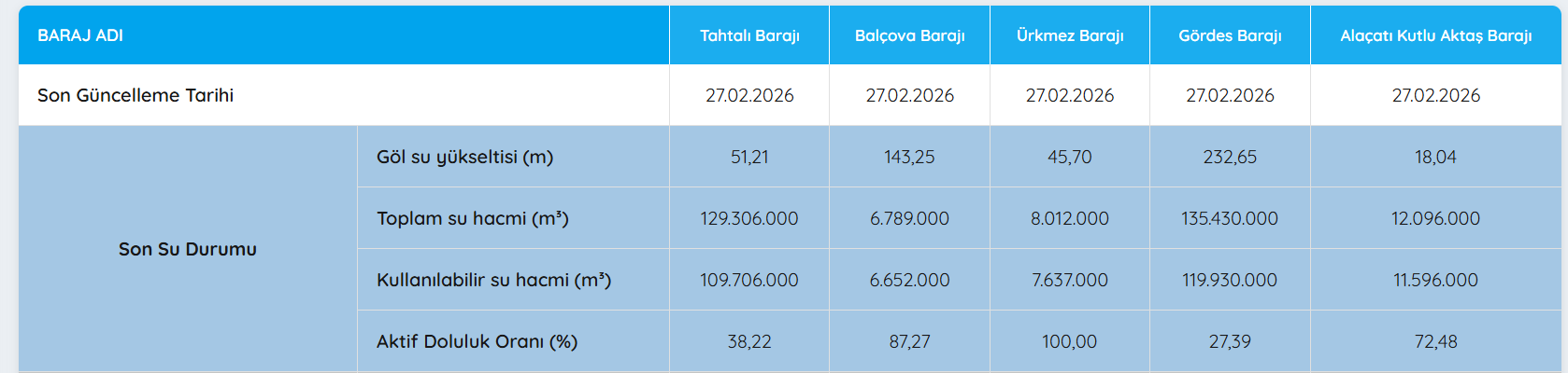 İzmir Su ve Kanalizasyon İdaresi Genel Müdürlüğü verilerine göre, İzmir’in içme suyu ihtiyacını karşılayan Tahtalı Barajı’ndaki aktif doluluk oranı yüzde 38,51 oldu. Barajda bugün itibarıyla yalnızca 110 milyon 553 bin metreküp kullanılabilir su bulunuyor. Geçen yıl aynı dönemde Tahtalı Barajı’ndaki doluluk oranı yüzde 15,51 seviyesindeydi.