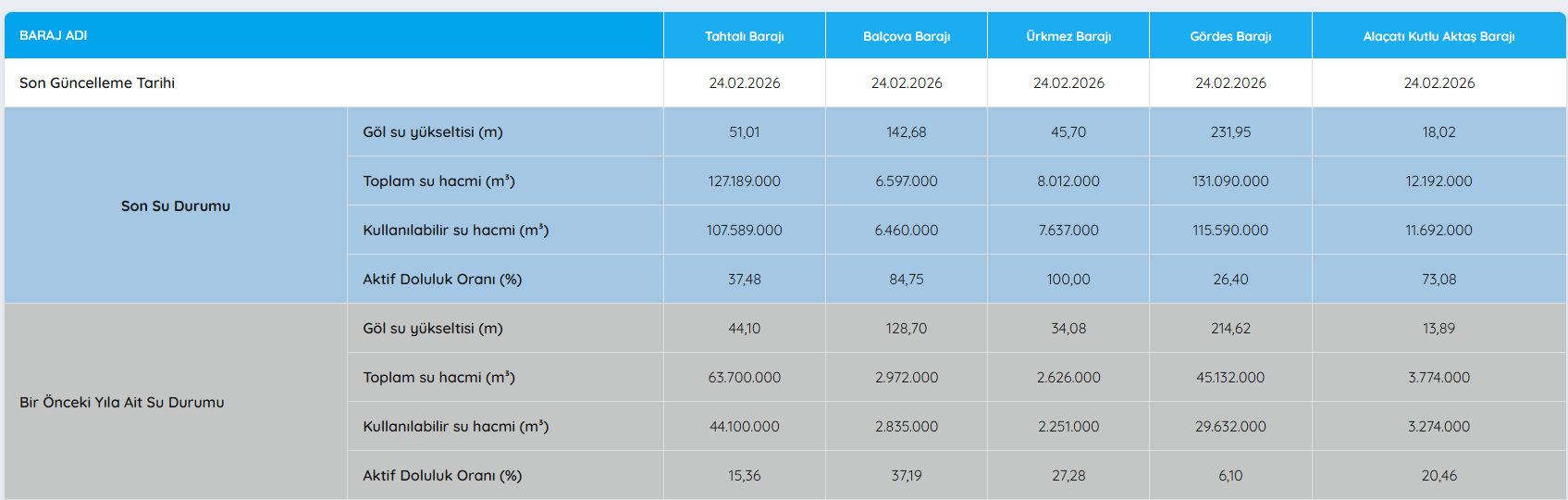 Tahtalı’nın yanı sıra diğer barajlardaki son durum ise şöyle: