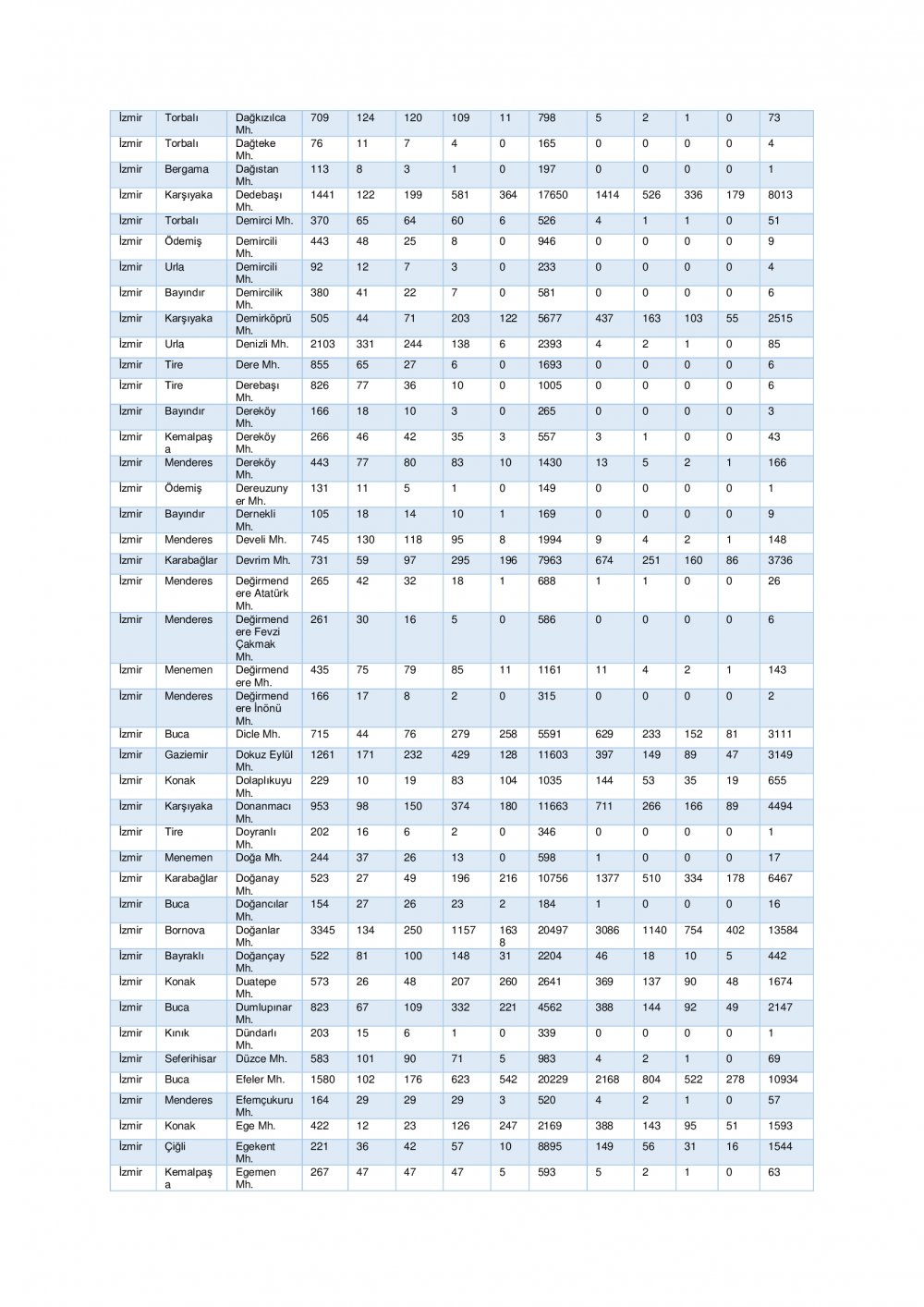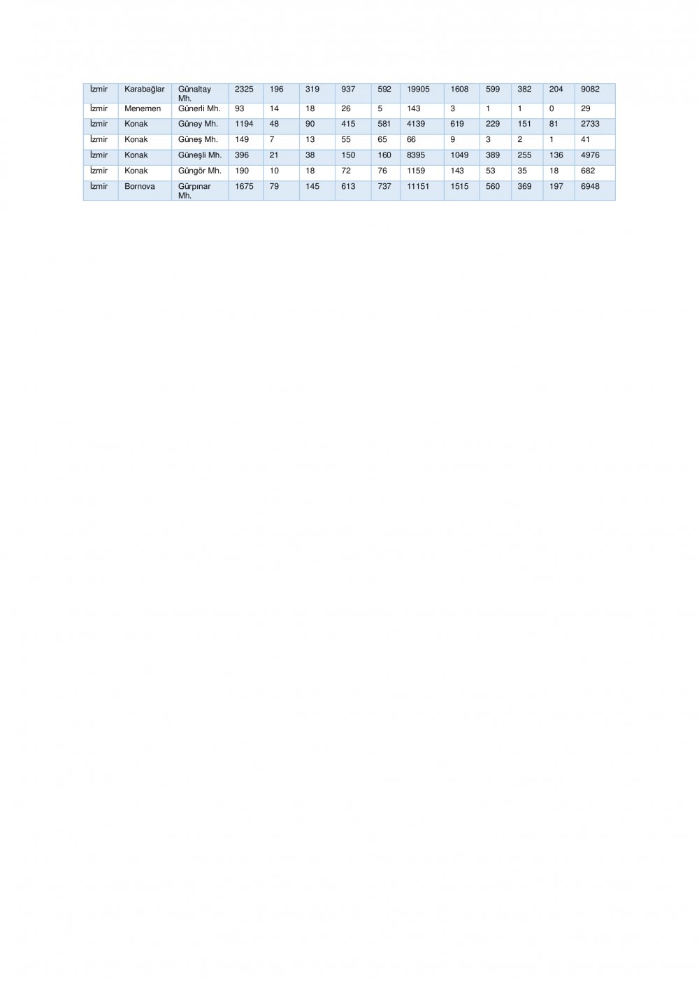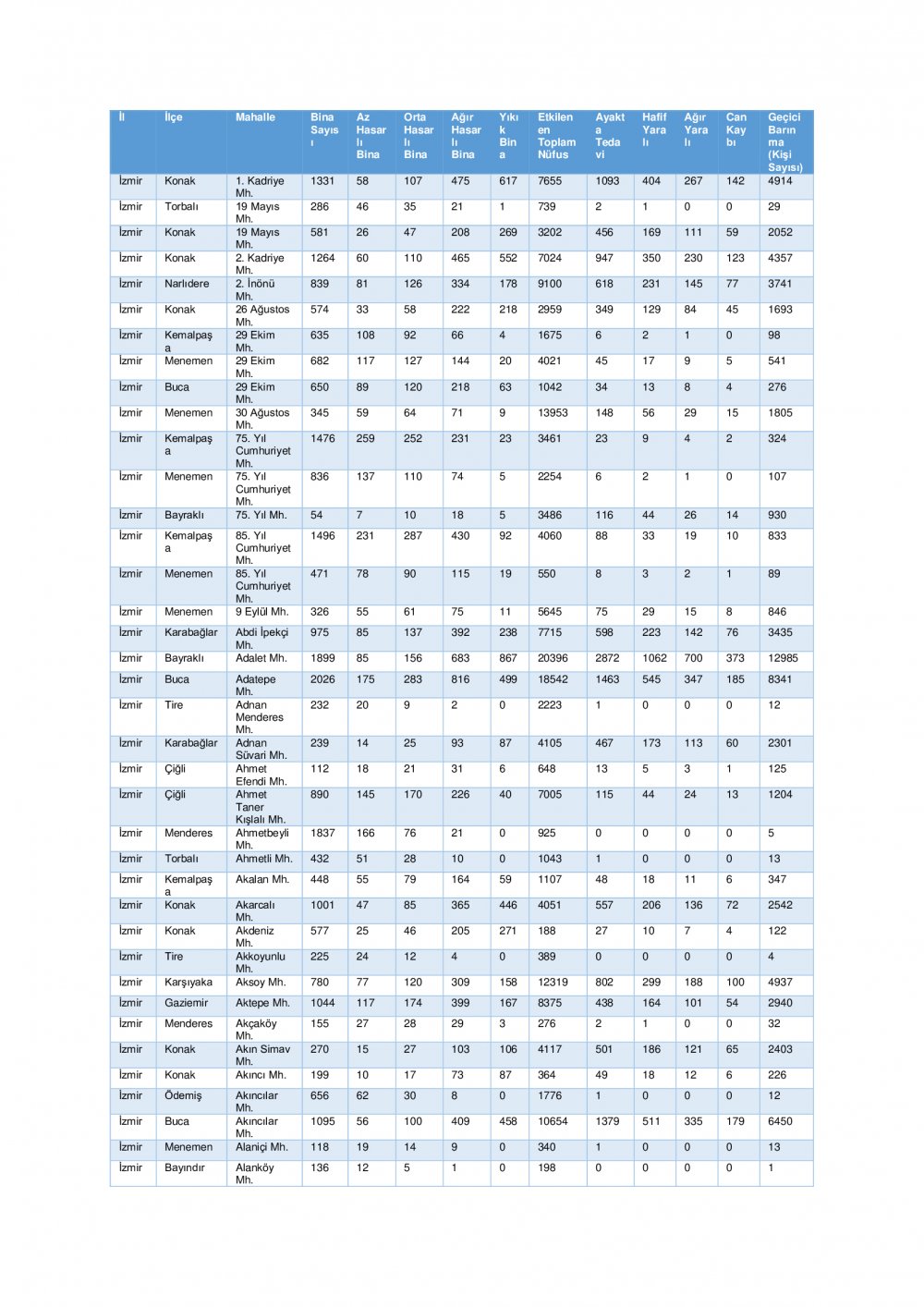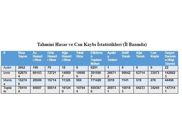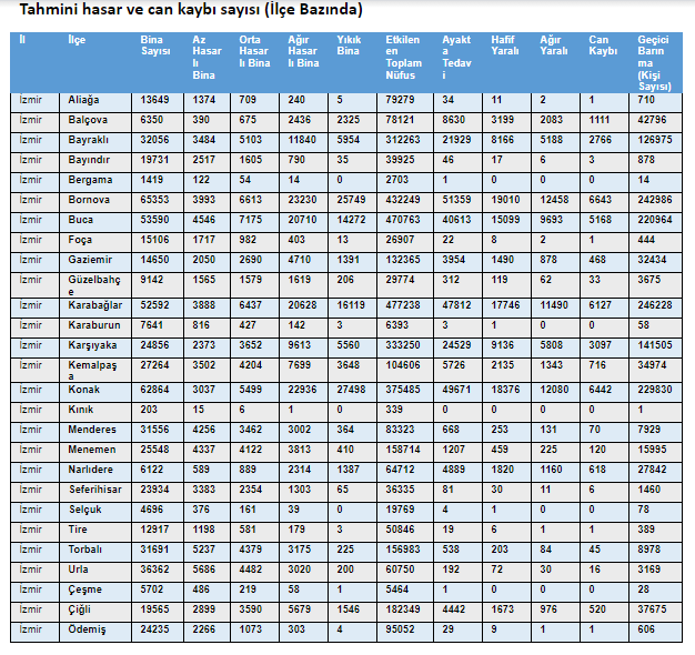 “İzmir ili ihtiyaç analizi ve kapasite geliştirme kararları için genişletilmiş senaryo” başlığı altında 7 şiddetinde meydana gelen deprem sonrası tahmini yaralı ve can kaybı ile hasarlı ve yıkık bina istatistikleri ile ilçe bazında tahmini yaralı ve can kaybı ile hasarlı ve yıkık bina istatistiklerine yer verildi.