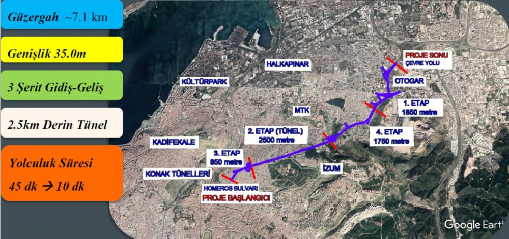 Tünel inşaatı yılsonunda tamamlanması hedeflenen viyadüklerle birlikte Konak'tan şehirlerarası otobüs terminaline ulaşımı kolaylaştıracak. Şehir içi trafiğe de nefes aldıracak projenin toplam uzunluğu 7,1 kilometreyi bulacak. Tünel tamamlandığında İzmir’in en uzun karayolu tüneli unvanına sahip olacak.