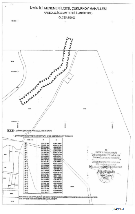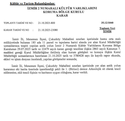 Kurulun 21 Ekim 2025 tarihli toplantısında (Toplantı No: 800 35.12/1040) alınan karara göre, Menemen ilçesi Çukurköy Mahallesi sınırları içinde yer alan ve Kurul Müdürlüğü uzmanlarınca tespiti yapılan antik yol, 1. derece arkeolojik sit alanı olarak tescil edildi.