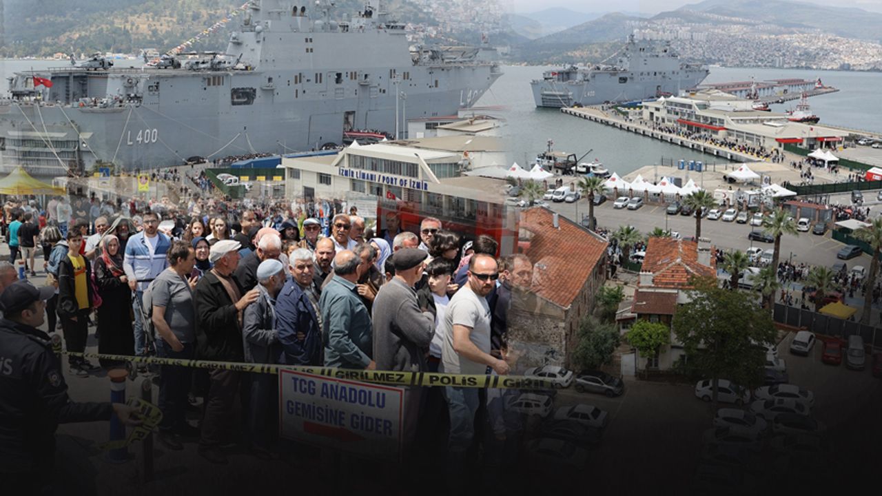 Hizmete 10 Nisan'da alınan ve İstanbul'un ardından 3 Mayıs'ta İzmir'de vatandaşların ziyaretine açılan yerli ve milli üretim TCG Anadolu'yu görmek isteyen çok sayıda vatandaş, Alsancak Limanı önünde uzun kuyruklar oluşturuyor.
