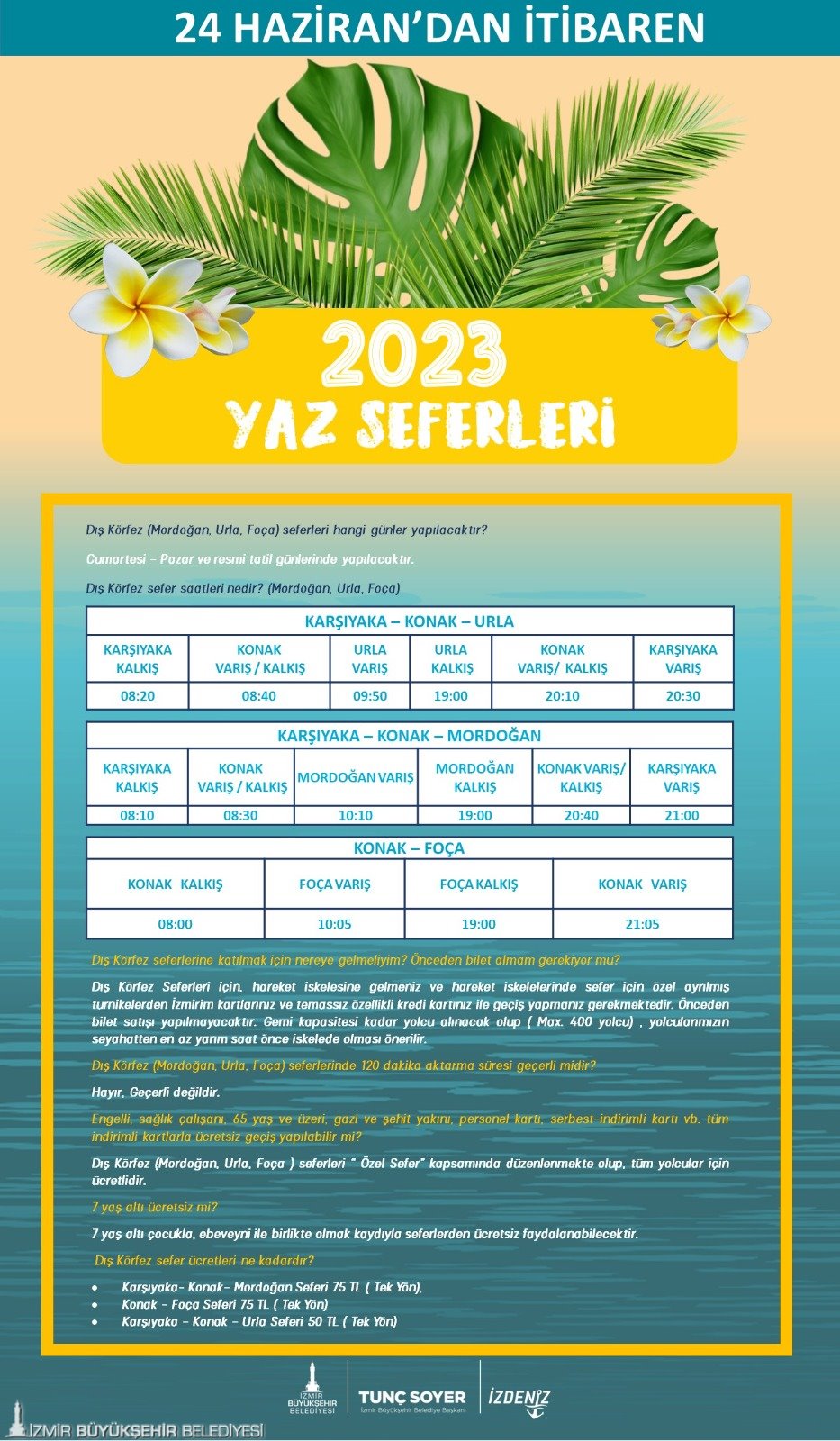 İzmir Büyükşehir Belediyesi İZDENİZ Genel Müdürlüğü, yaz seferlerine başlıyor. İzmirlilerin yazlık ilçelere deniz yoluyla ulaşımını sağlayacak seferler, 24 Haziran Cumartesi gününden itibaren Foça, Urla ve Mordoğan’da başlayacak. 3 Eylül Pazar gününe kadar devam edecek seferler hafta sonları ve resmi tatillerde yapılacak.