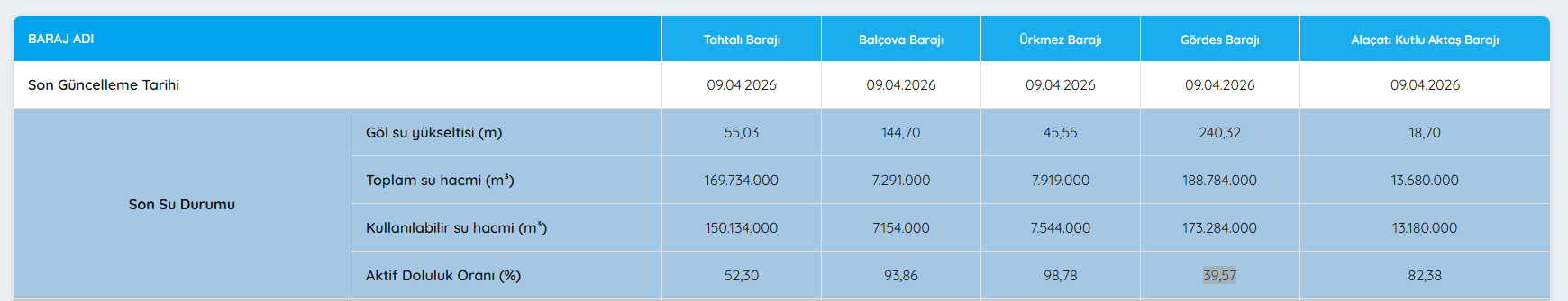 İzmir’deki barajların güncel doluluk oranları ise şöyle:
