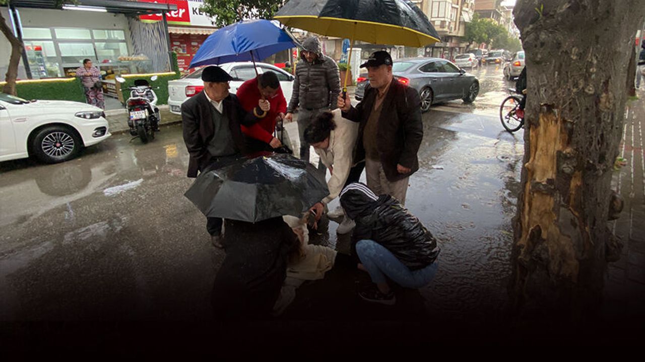 Kazada sürücünün yola savrulup yaralandığını gören vatandaşlar, yaralının yağmurda ıslanmaması için üzerine şemsi tutup ambulans gelene kadar yanında bekledi.