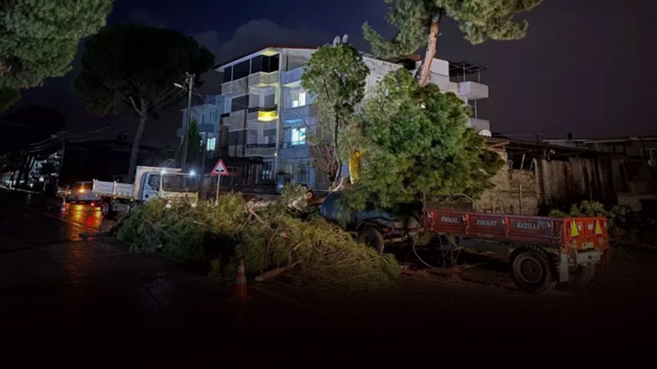 Şirinevler Mahallesi Beşeylül Caddesi'ndeki bir çam ağacı şiddetli fırtına nedeniyle kökünden devrilirken, elektrik tellerini de kopardı.