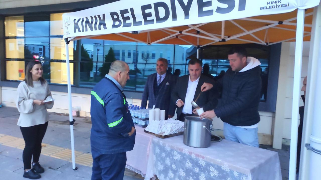 Kınık Belediyesi, Kınık Devlet Hastanesi önünde hem tüm hastane personeline hem de hasta ve hasta yakınlarına Ramazan ayının başından beri içlerini ısıtacak sıcak çorba dağıtıyor.