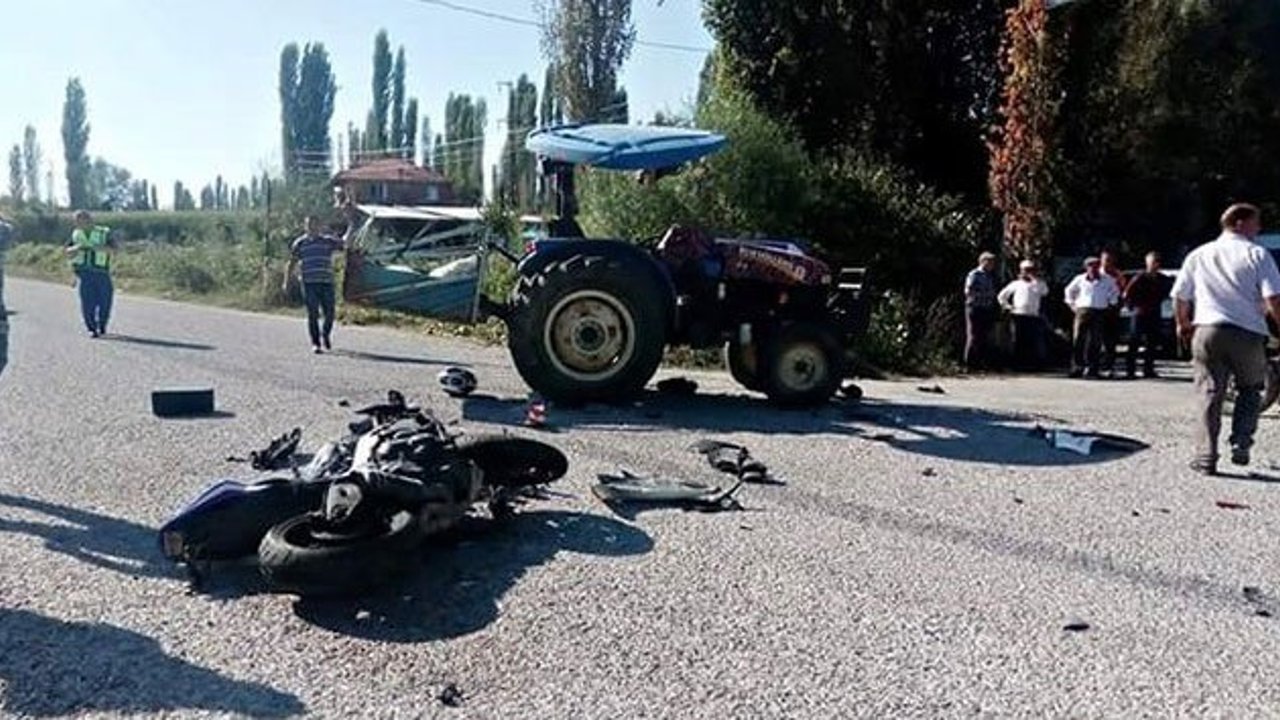Alınan bilgiye göre, S.K. (44) yönetimindeki 20 AJL 073 plakalı traktör Karaburç Mahallesi'nde Hasan T'nin (17) kullandığı plakasız motosikletle çarpıştı.