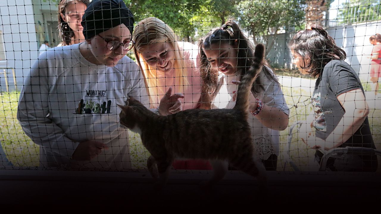 Çocuklar merkezdeki engelli kedileri doyasıya severek hayvanları daha yakından tanıma imkanı buldu.