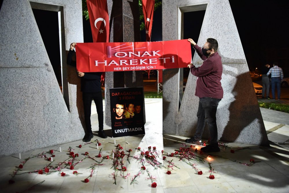 Sabahın erken saatlerinde 'Üç Fidan Anıtı' önünde bir anma töreni düzenleyen Konak Hareketi Lideri Coşkun Kalkanlı, burada yaptığı konuşmada, "Biz Denizlerin meşalesini taşıyoruz. Biz tam bağımsızlık ve gerçek demokrasiyi savunuyoruz. Devrimciliğimin olanca ateşiyle selamlıyorum" ifadelerini kullandı.