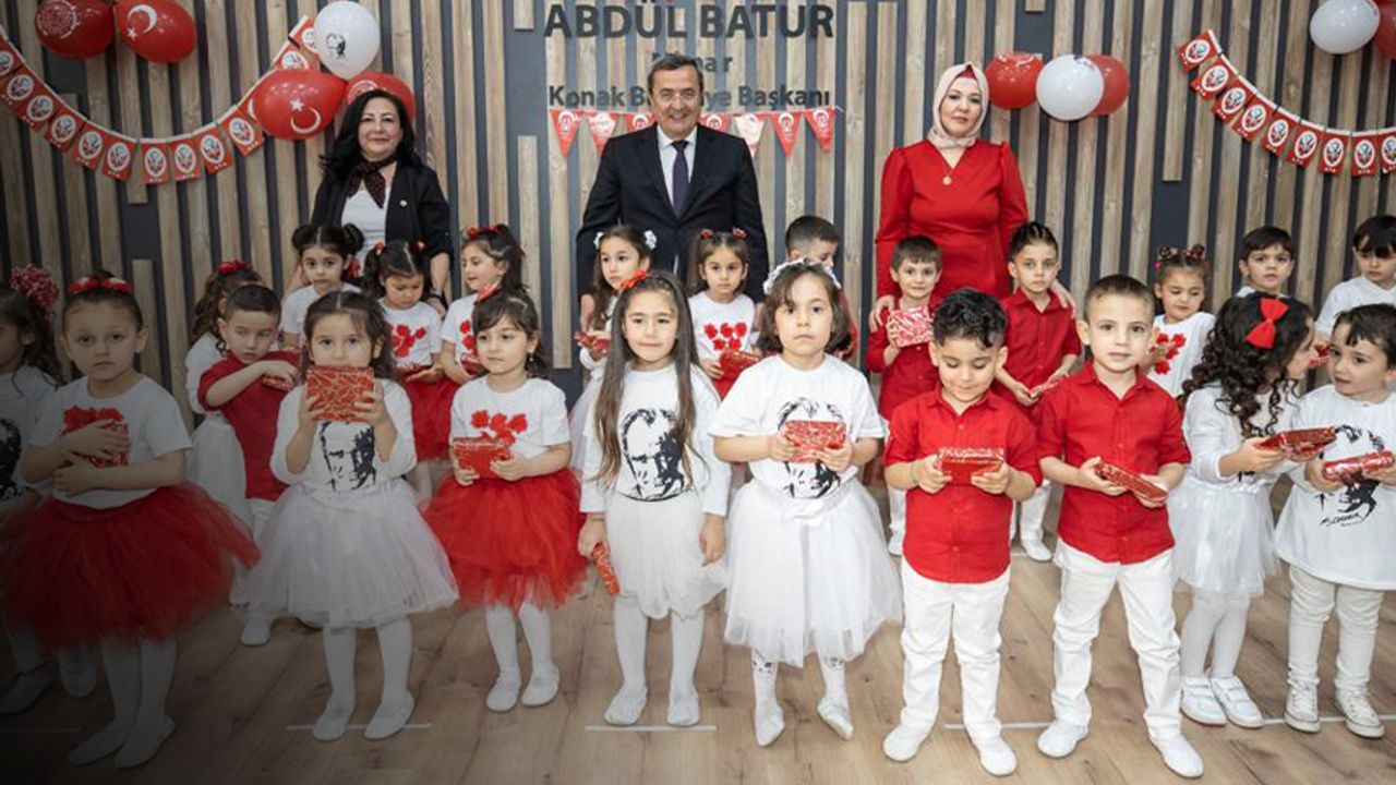 Konak Belediyesi’nin eğitimde fırsat eşitliği yaratan projesi Minikler Konağı’nın öğrencileri, 23 Nisan Ulusal Egemenlik ve Çocuk Bayramı etkinlikleri kapsamında muhteşem bir gösteri sahneledi. Belediyenin Toros Sosyal Tesisinde düzenlenen 23 Nisan gösterisini Konak Belediye Başkanı Abdül Batur, CHP Konak İlçe Başkanı Akın Küçükoğullarından, çocukların aileleri ve muhtarlar izledi. Minikleri bol bol alkışlayan, gösterilerini heyecanla takip eden Başkan Batur, “İşte, Ulu Önder Mustafa Kemal Atatürk’ün emanet ettiği cumhuriyetimizi yaşatacak çocuklar. İşte, Atatürk’ün çocukları. Sizler bizim umudumuz, geleceğimiz, her şeyimizsiniz. Sizleri çok seviyoruz” dedi.