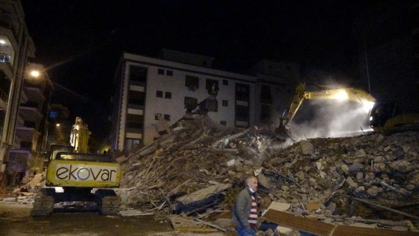 İzmir'de geçen yıl 30 Ekim’de meydana gelen 6.6 büyüklüğündeki depremin ardından hasarlı binaların yıkımı için çalışma başlatıldı. Çalışmalar kapsamında, bugün saat 17.30 sıralarında Karşıyaka ilçesine bağlı Şemikler Mahallesi'nde, hasarlı olduğu tespit edilen 8 katlı bir binanın yıkımı sırasında, yakınında bulunan ve sağlam olduğu ifade edilen 5 katlı yeni binanın üzerine devrildi. Ayrıca, bu sırada çalışma yapan bir iş makinesinin üzerine de moloz yığınlarının düştüğü görüldü. Meydana gelen olay sonrası, iş makinesi operatörü kendi imkanları ile dışarıya çıkarken, 8 katlı binanın devrilmesi sonucu yanında bulunan binada büyük çapta hasar oluştu. İhbar üzerine bölgeye çok sayıda polis, sağlık, AFAD ve itfaiye ekipleri sevk edildi. Polis ekipleri çevrede geniş güvenlik önlemi alırken, olayda ölen ya da yaralananların olmadığı bildirildi. Ekipler, evlerine girerek eşyalarını almak isteyen vatandaşları uyarırken, bölgede çalışmaların sürdüğü belirtildi.