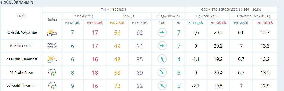 Meteorolojik tahminlere göre kentte Perşembe ve Cuma günleri parçalı bulutlu bir gökyüzü hâkim olacak. Hava sıcaklıklarının gündüz saatlerinde 16–17 derece, gece saatlerinde ise 6–7 derece civarında seyretmesi bekleniyor. Cumartesi günü de benzer bir tablo öngörülürken, sıcaklıkların 16 dereceye kadar çıkacağı tahmin ediliyor.
