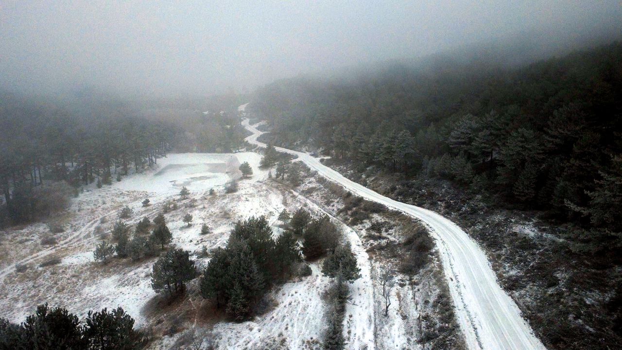 Manisa'nın Demirci ilçesinin yüksek kesimlerinde kar yağışı etkili oldu. 1500 rakımlı Başalan Yaylası'nda beyaz örtü ile birlikte oluşan seyirlik manzara, dron ile görüntülendi.