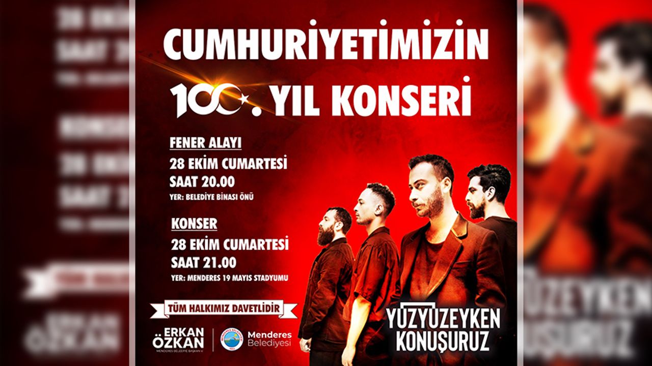 Menderes Belediyesi Kültür ve Sosyal İşler Müdürlüğü tarafından sürdürülen çalışmalar kapsamında ilçe geneli Türk bayraklarıyla donatılacak. Kutlamaların başlangıcı tüm vatandaşların katılabileceği Cumhuriyet Halk Koşusu ile olacak. 3 kilometrelik parkurda düzenlenecek koşuya katılanlara 100. Yıla özel hatıra madalyası verilecek. Aynı günün akşamında Menderes Belediyesi önünden başlayıp 19 Mayıs Stadı’nda sona eren fener alayı düzenlenecek ve sonrasında Yüzyüzeyken Konuşuruz Grubu’nun konseri gerçekleşecek.