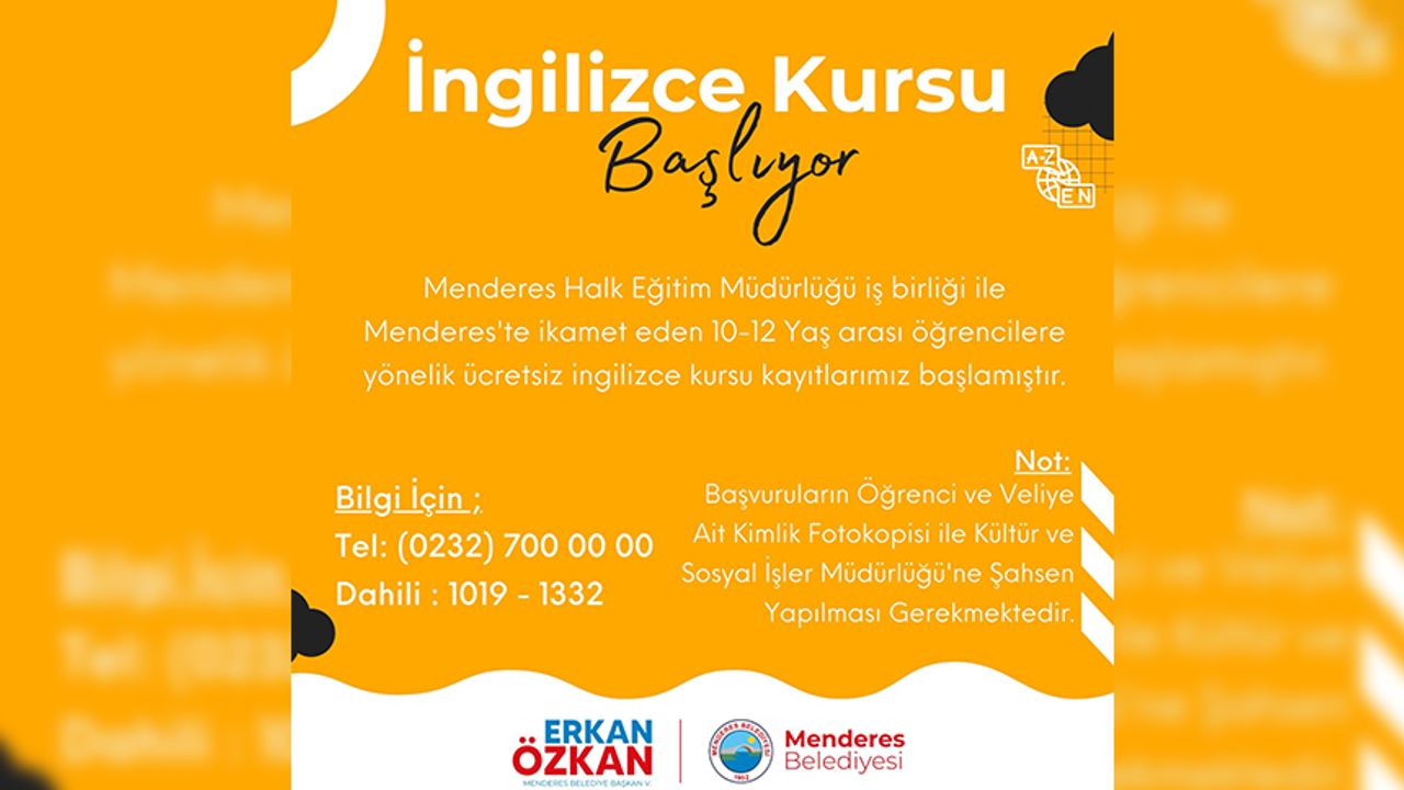 Menderes Belediyesi’nin, Menderes İlçe Halk Eğitim Merkezi’nin işbirliğiyle gerçekleştireceği İngilizce kursu için kayıt dönemi başladı. Ücretsiz kurstan yararlanmak isteyenler belediyeye başvurarak kayıt yaptırabilecek.