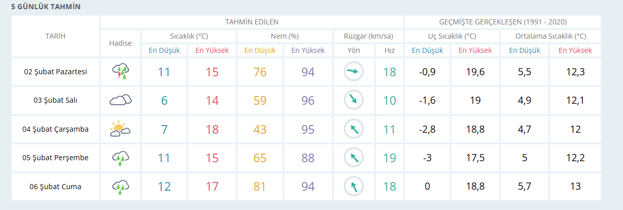 Tahminlere göre yağışlı hava 5 Şubat Perşembe ve 6 Şubat Cuma günü yeniden etkili olacak. Haftanın diğer günlerinde ise çok bulutlu ve parçalı bulutlu bir hava öngörülüyor. Beş günlük periyot boyunca hava sıcaklıklarında belirgin bir düşüş beklenmezken, en yüksek sıcaklıkların 14 ile 18 derece arasında seyredeceği tahmin ediliyor. Ilıman hava koşullarının hafta boyunca genel olarak korunacağı öngörülüyor.