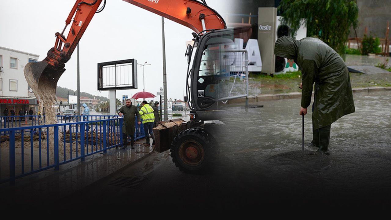 Çeşme Belediyesi ekipleri de yollarda biriken suyun tahliye edilmesi için çalışma başlattı.
