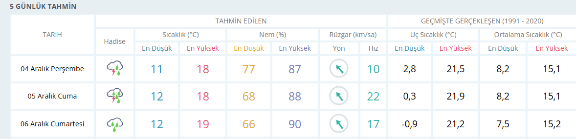5 Aralık Cuma günü yağışın devam edeceği, gün boyu aralıklarla sağanak yağış görüleceği bildirildi. Cuma günü sıcaklıkların 12–18 derece aralığında seyredeceği tahmin ediliyor.