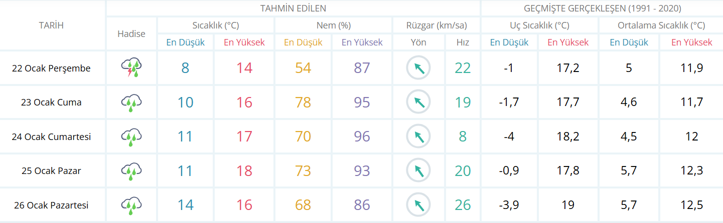 Tahminlere göre Perşembe, Cuma, Cumartesi, Pazar ve Pazartesi günleri boyunca İzmir’de sağanak yağış etkisini sürdürecek. Hava sıcaklıklarının gece saatlerinde 8 ila 14 derece arasında, gündüz saatlerinde ise 14 ila 18 derece aralığında seyretmesi bekleniyor. Yağışlı hava ile birlikte sıcaklıklarda belirgin bir artış ya da düşüş öngörülmezken, bulutlu ve kapalı bir gökyüzünün kent genelinde etkili olacağı tahmin ediliyor.