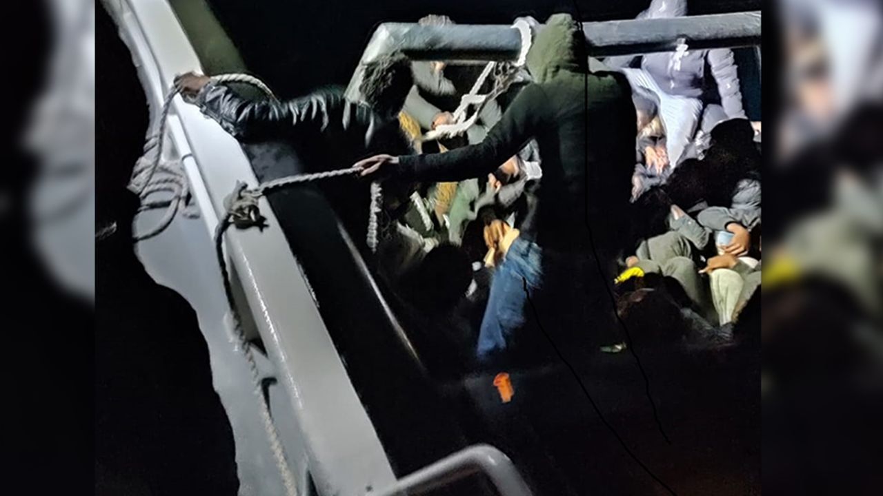 Sahil Güvenlik Komutanlığından yapılan açıklamaya göre, ekipler, ilçe açıklarında can sallarında bir grup göçmenin bulunduğu ihbarı üzerine bölgeye hareket etti.