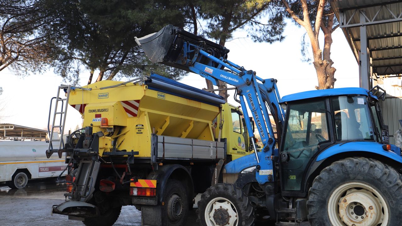 Ödemiş Belediyesi Destek Hizmetleri Şantiyesi ve Bozdağ Şantiyesi’nde tuz depolaması yapılırken kar küreme araçları ve diğer iş makineleri de göreve hazır bekletiliyor.