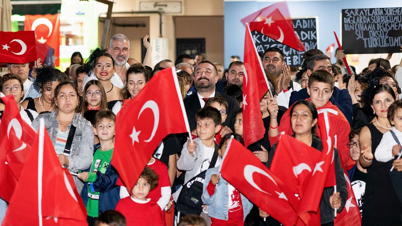 Belediye Başkanı Mustafa Turan yaptığı konuşmada; “Cumhuriyet hayattır.Bu nedenle Cumhuriyetimizi gözümüz gibi korumak, çağdaş uygarlık hedefinden uzaklaşmadan Atatürk’ün açtığı yoldan yürümek dışında bir seçeneğimiz yok. Ülkemizin çevresindeki ateş çemberine baktığımızda, Cumhuriyetimizin kuruluş felsefesinin ne kadar değerli ve önemli olduğunu görüyoruz. Tüm bu şartlarda Gençliğe Hitabe’den aldığımız güç ve sorumlulukla, birinci vazifemizi gerekirse canımız pahasına yerine getirip vatanımızın bir çakıl taşını bile vermeyeceğiz. Yoklukları yok sayarak mücadele edenlerin, vatanını canından aziz bilenlerin bizlere bıraktığı mirasa sahip çıkmak zorundayız. Kimse umudunu yitirmesin. Umudunu kaybeden geleceğini de kaybeder. Cumhuriyetimizin en büyük kazanımı olan millet egemenliğini aşındırmaya, demokrasiyi yok etmeye kimsenin gücü yetmemiştir, yetmeyecektir. Kimse karanlıktan korkmasın. Aydınlık karanlığı daima yener” dedi.