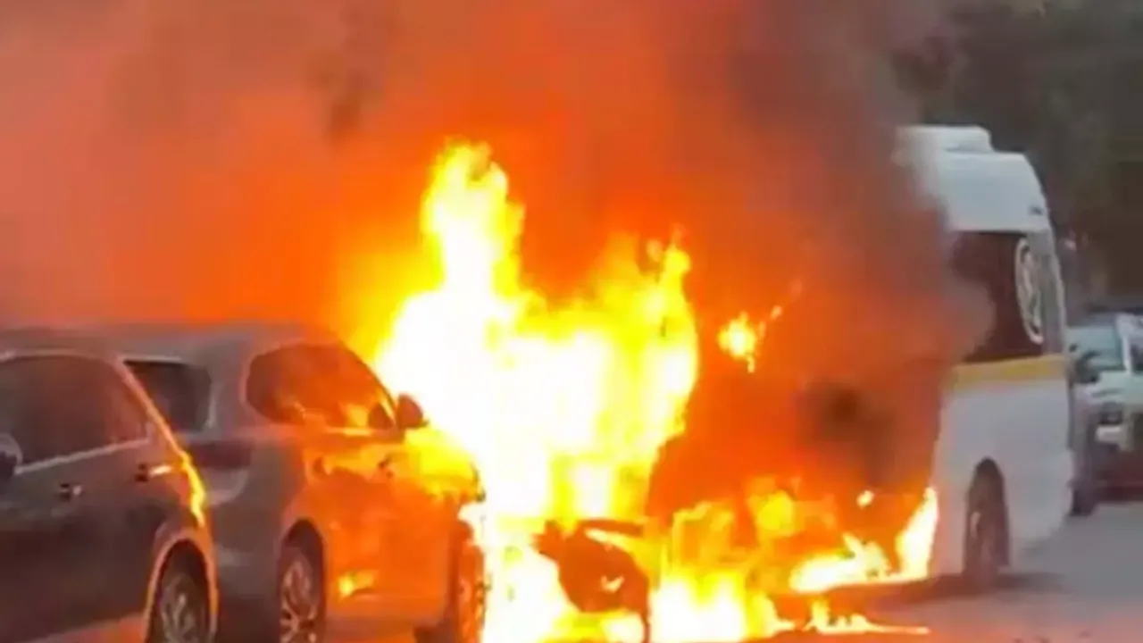 Kısa sürede büyüyen alevler, park halindeki elektrikli otomobile sıçradı. İhbarla olay yerine polis ve itfaiye ekipleri sevk edildi.