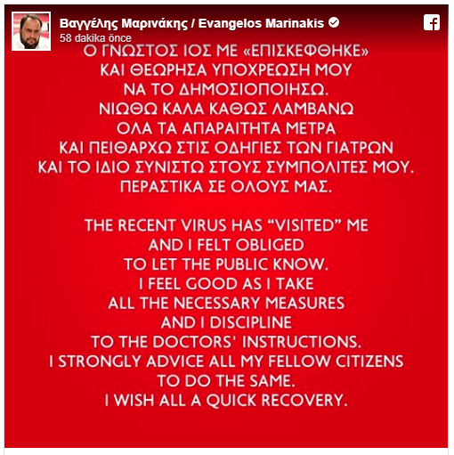 "Koronavirüs beni de ziyaret etti ve kendimi kamuoyunu bilgilendirmek zorunda hissettim. Kendimi iyi hissediyorum çünkü tüm gerekli önlemleri aldım ve doktorların tavsiyelerine uyuyorum. Tüm dostlarıma ve vatandaşlarıma aynısını tavsiye ediyorum."