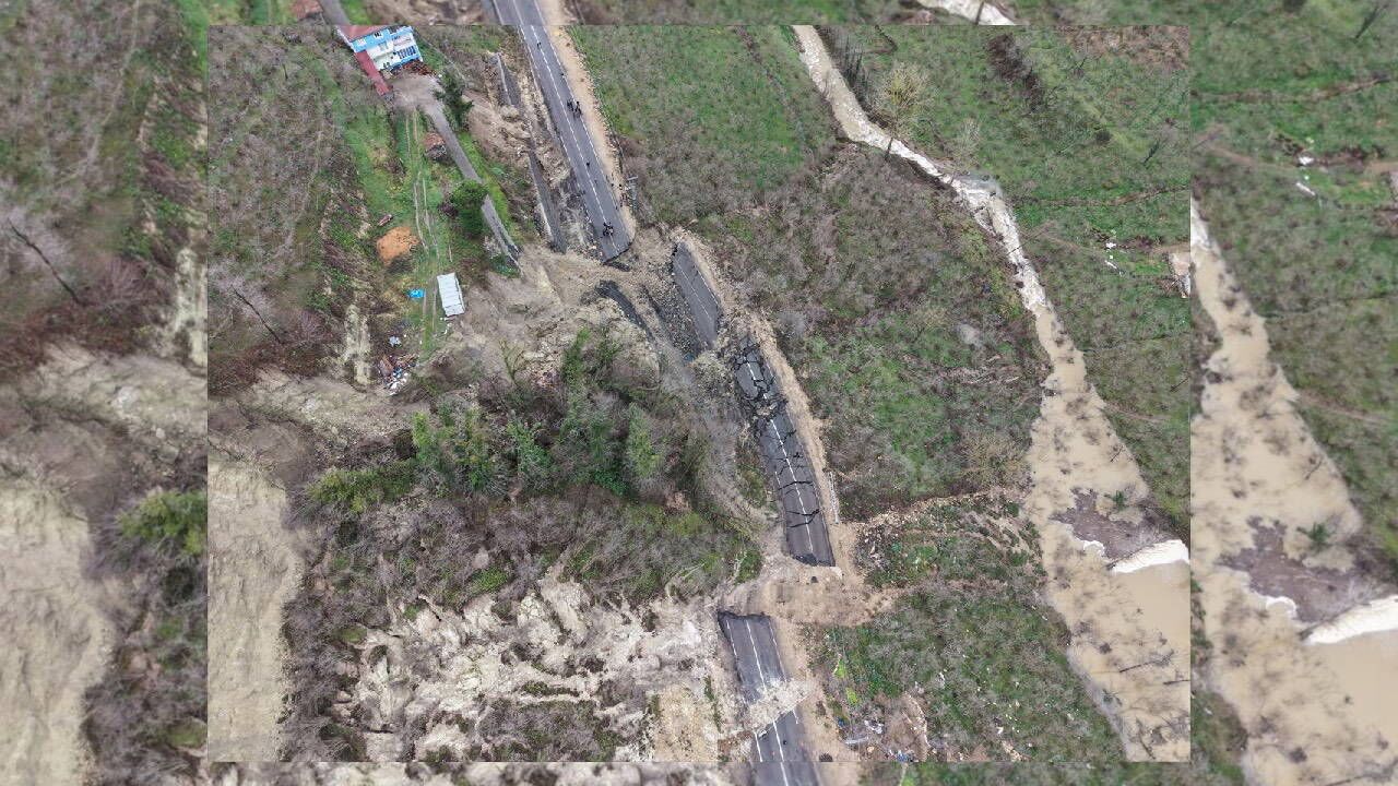 Öte yandan Ünye ve Akkuş ilçelerini birbirine bağlayan yoldaki heyelan, dronla görüntülendi.